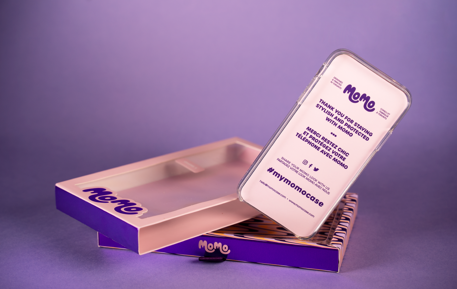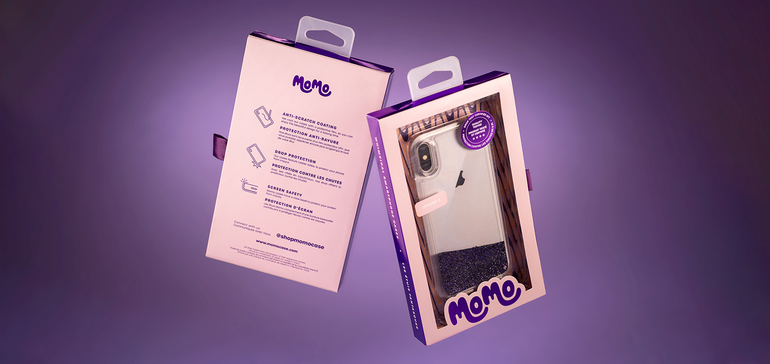 After designing a new brand identity for Toronto-based tech accessory company Momo Case, inspired by 70s posters and textiles, we were tasked to rethink their retail packaging.