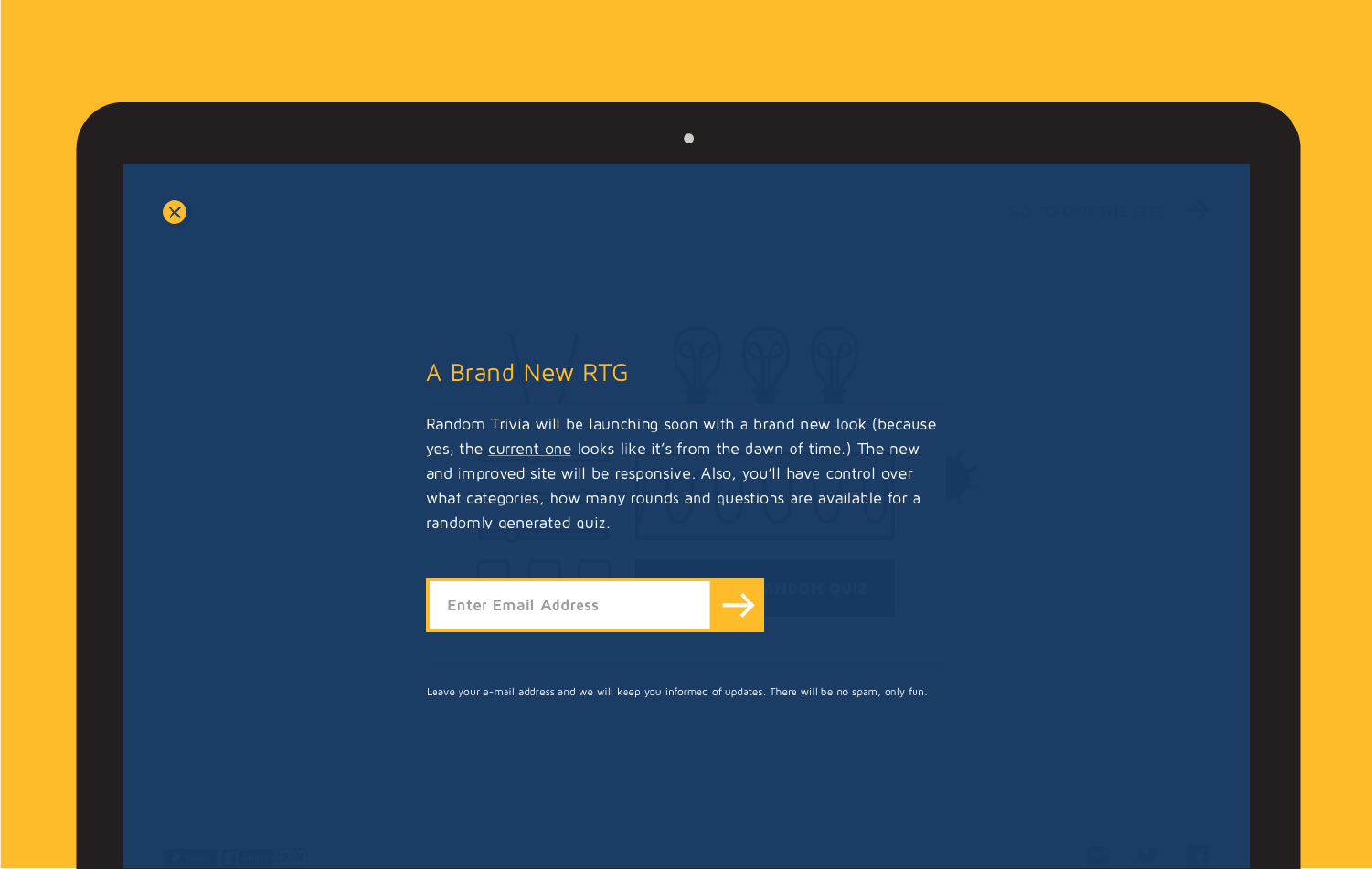 We created a holding page for the popular quiz-generating app Random Trivia Generator, to inform the existing audience of the upcoming redesign and to engage new users.